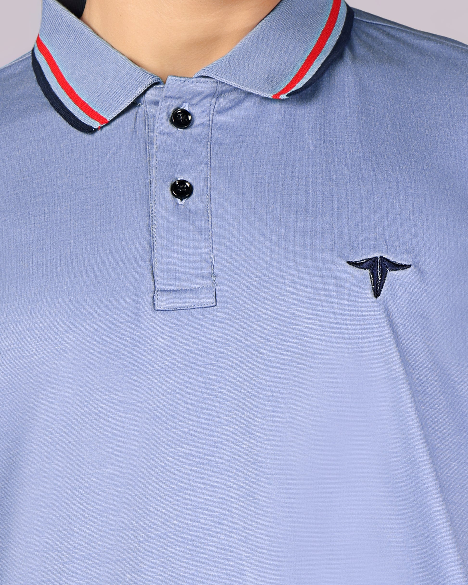 Add a touch of cool elegance to your wardrobe with the Tim Cooper Rich Club sky blue Polo T-Shirt. This refreshing piece features a soft sky blue shade, complemented by sleek red and black tipping on the collar and sleeve cuffs for a stylish contrast. Designed with a classic polo collar and short sleeves, the t-shirt offers a relaxed yet polished silhouette, making it perfect for both casual and semi-formal settings. The premium cotton fabric ensures breathability and comfort throughout the day.