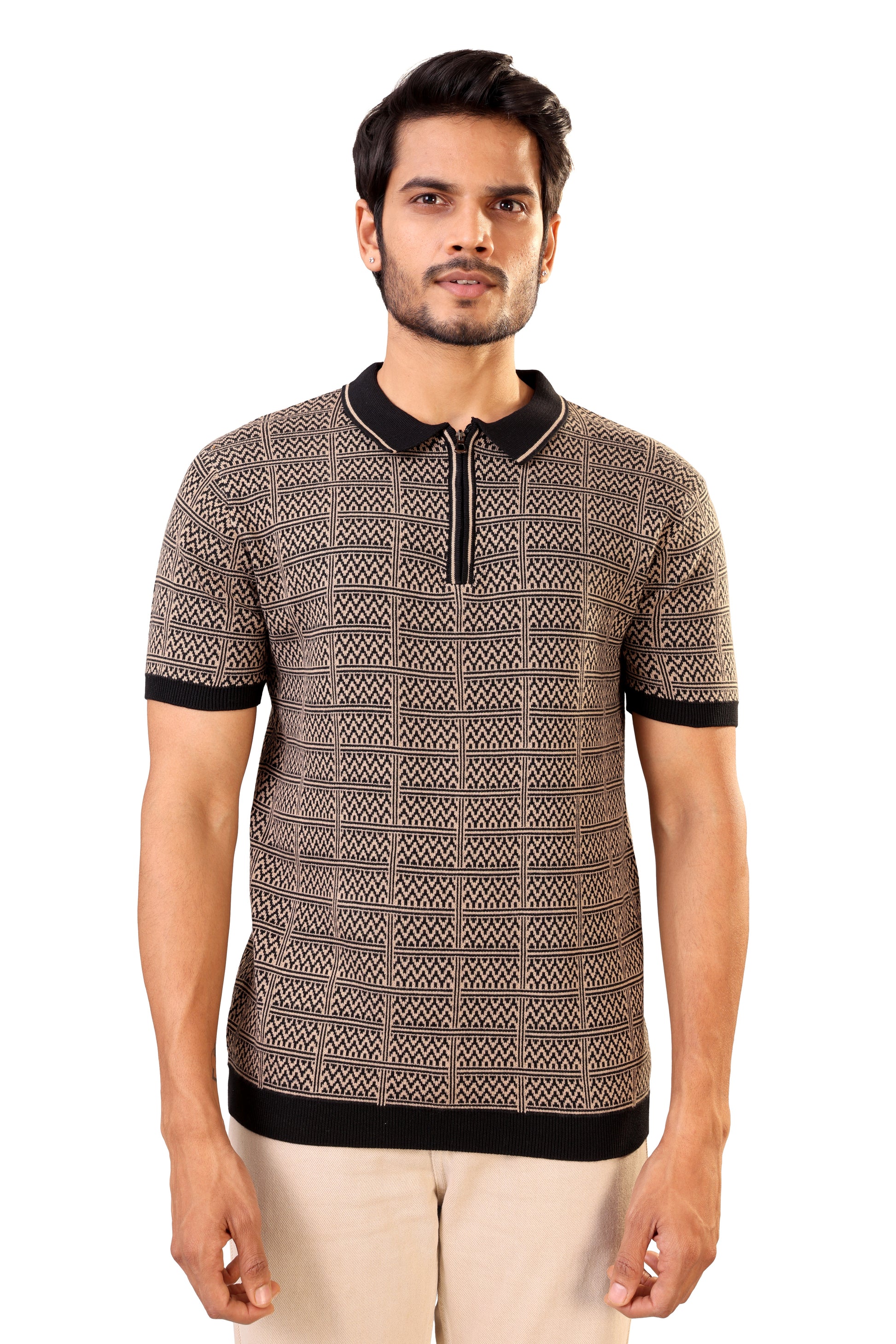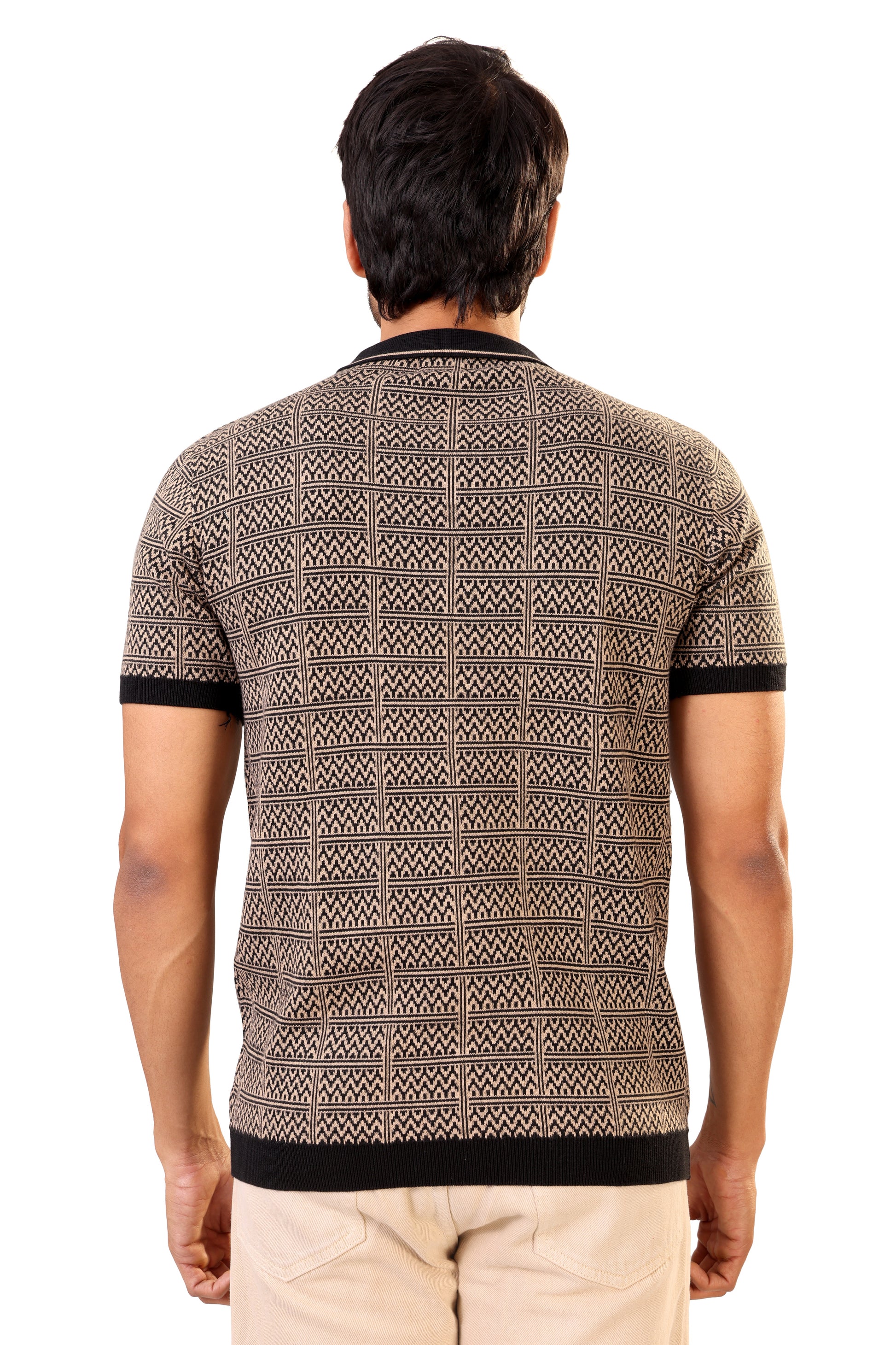- Design : Features an intricate geometric knit pattern in beige and black. Classic polo collar in solid black for a sharp contrast.