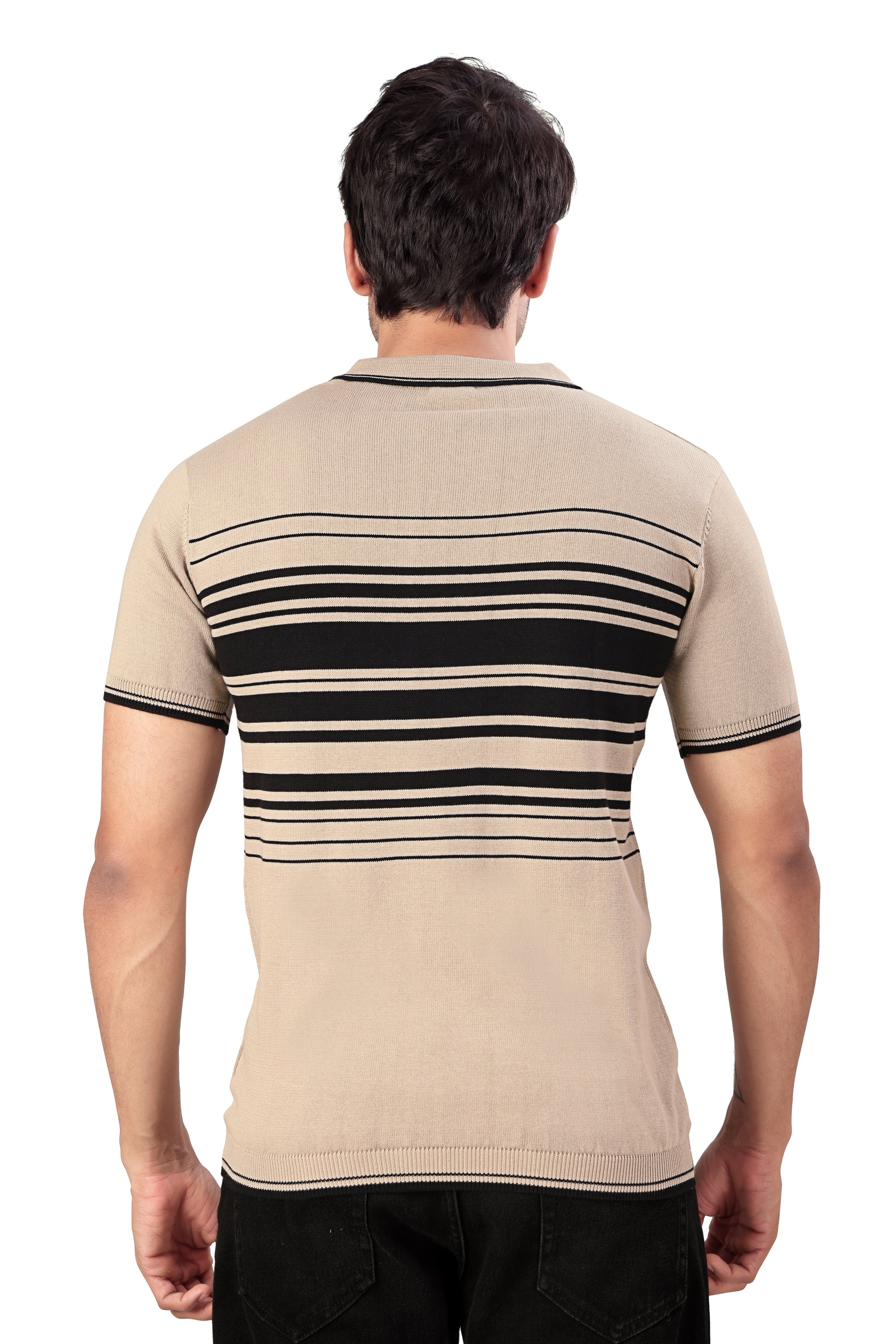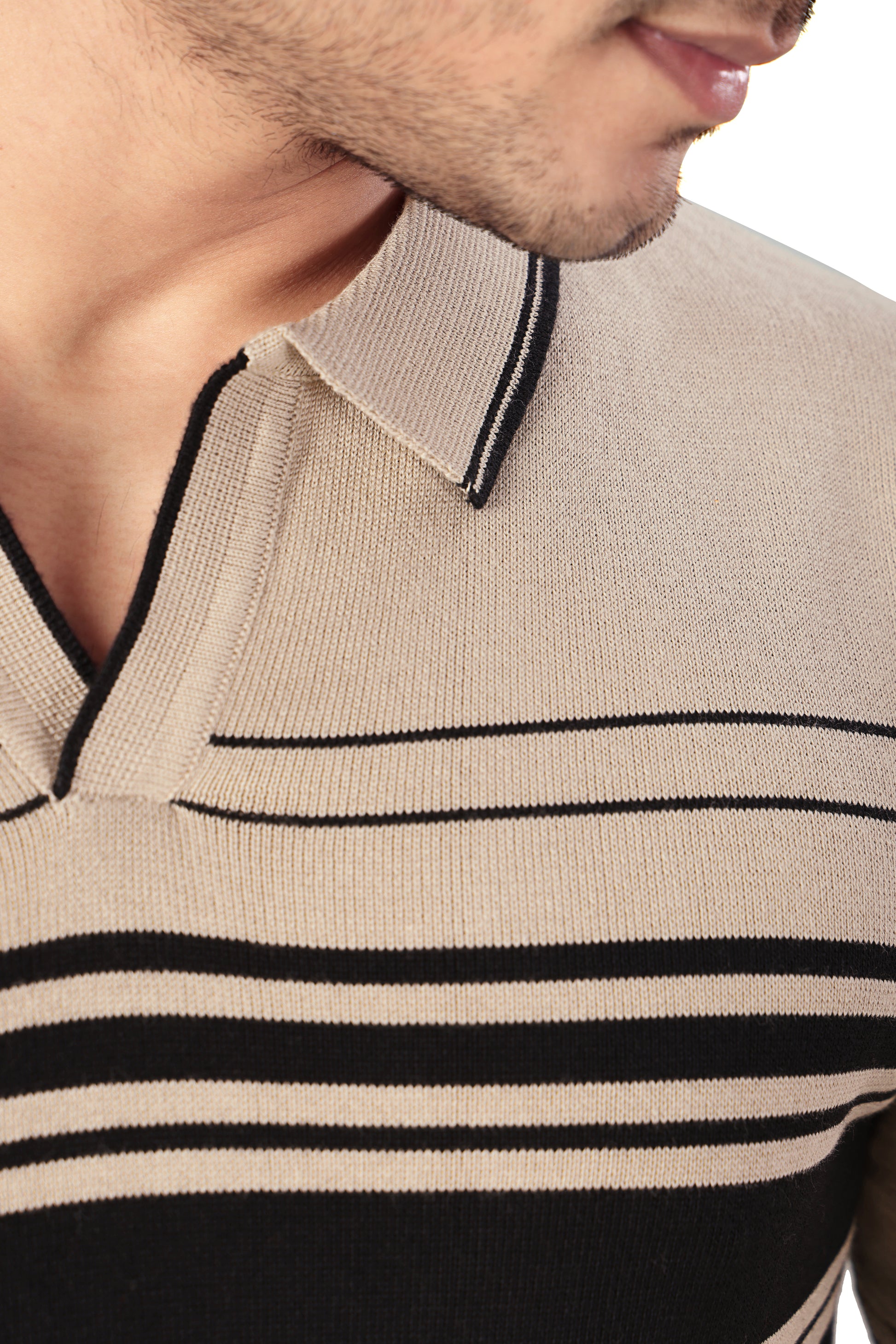 A classic men’s knit polo t-shirt featuring a refined beige base with contrasting black horizontal stripes for a timeless, versatile look. Designed with a soft collar, partial placket, and short sleeves, it offers a comfortable regular fit with a premium knit feel. Ideal for everyday wear or smart-casual occasions, this polo pairs effortlessly with jeans, chinos, or trousers.