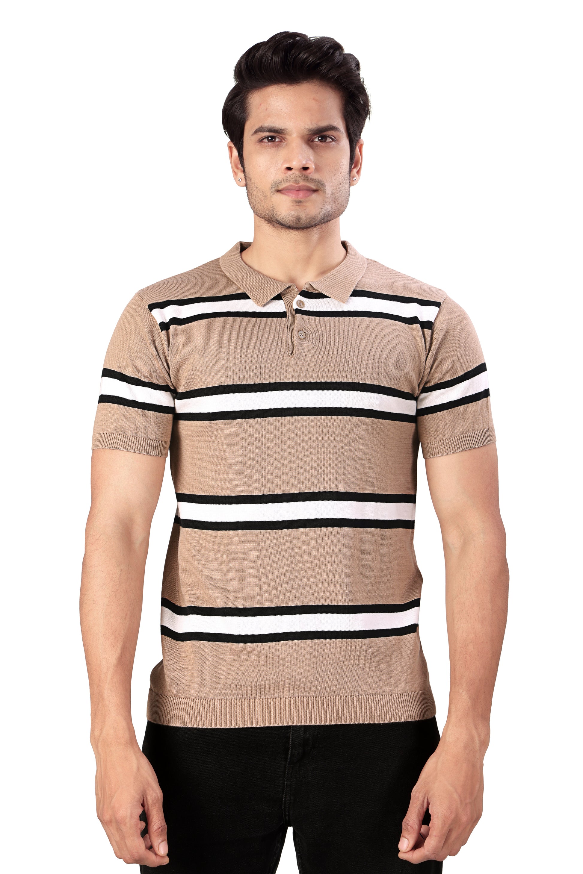 A stylish men’s beige polo t-shirt featuring horizontal black and white stripes, designed with a classic collar and button placket. Made from soft, breathable knit fabric, it offers a comfortable regular fit suitable for casual wear, outings, or smart-casual occasions. The neutral color palette makes it easy to pair with jeans, chinos, or trousers.