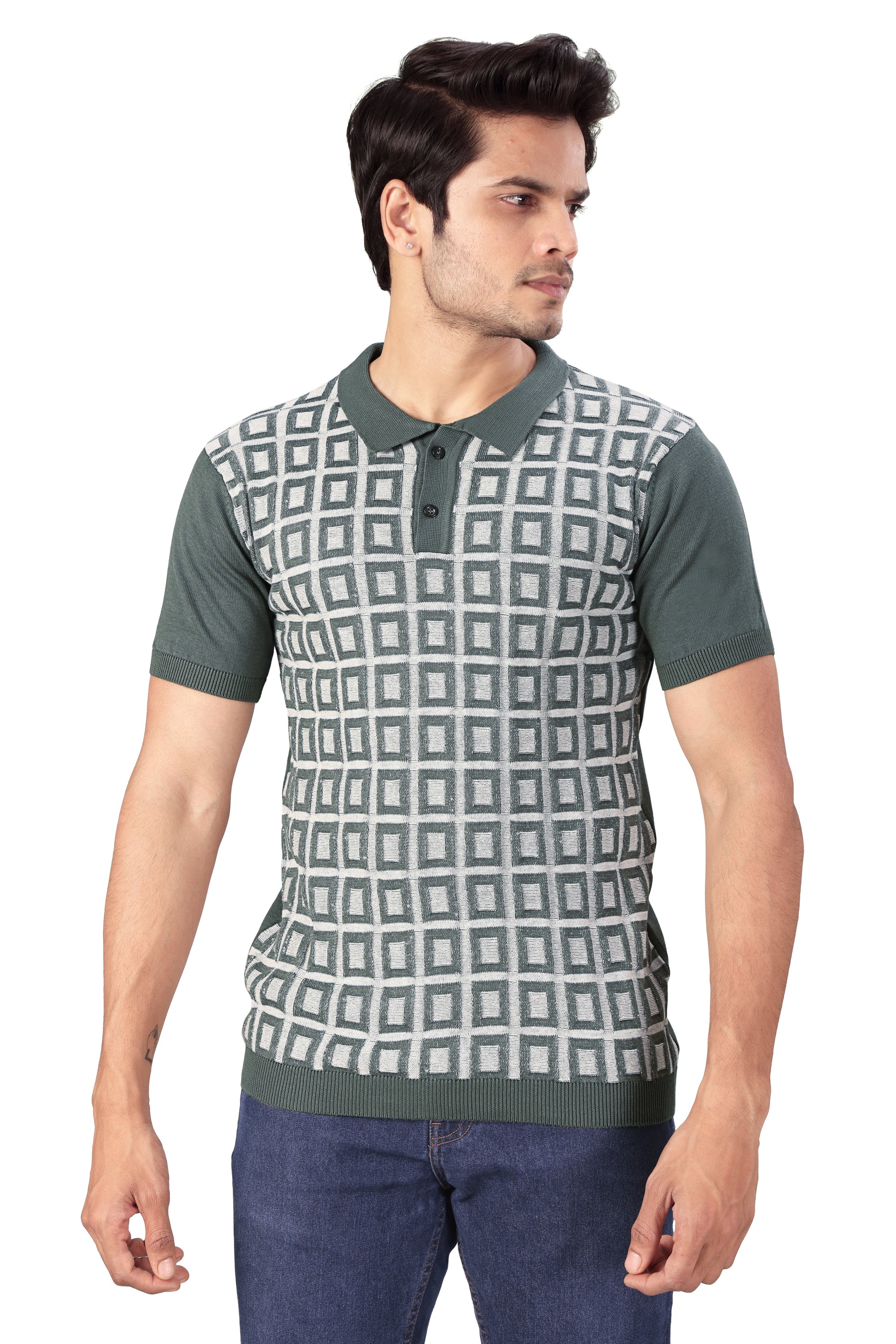 This men’s knitted polo T-shirt features a classic collar and short sleeves with a stylish all-over geometric check pattern on the front. Designed with a comfortable knit fabric, it offers a smart yet relaxed look suitable for everyday wear. The solid-colored collar, sleeves, and hem provide a clean contrast, making it easy to pair with trousers or jeans. Ideal for casual outings, office-casual settings, or relaxed social occasions.