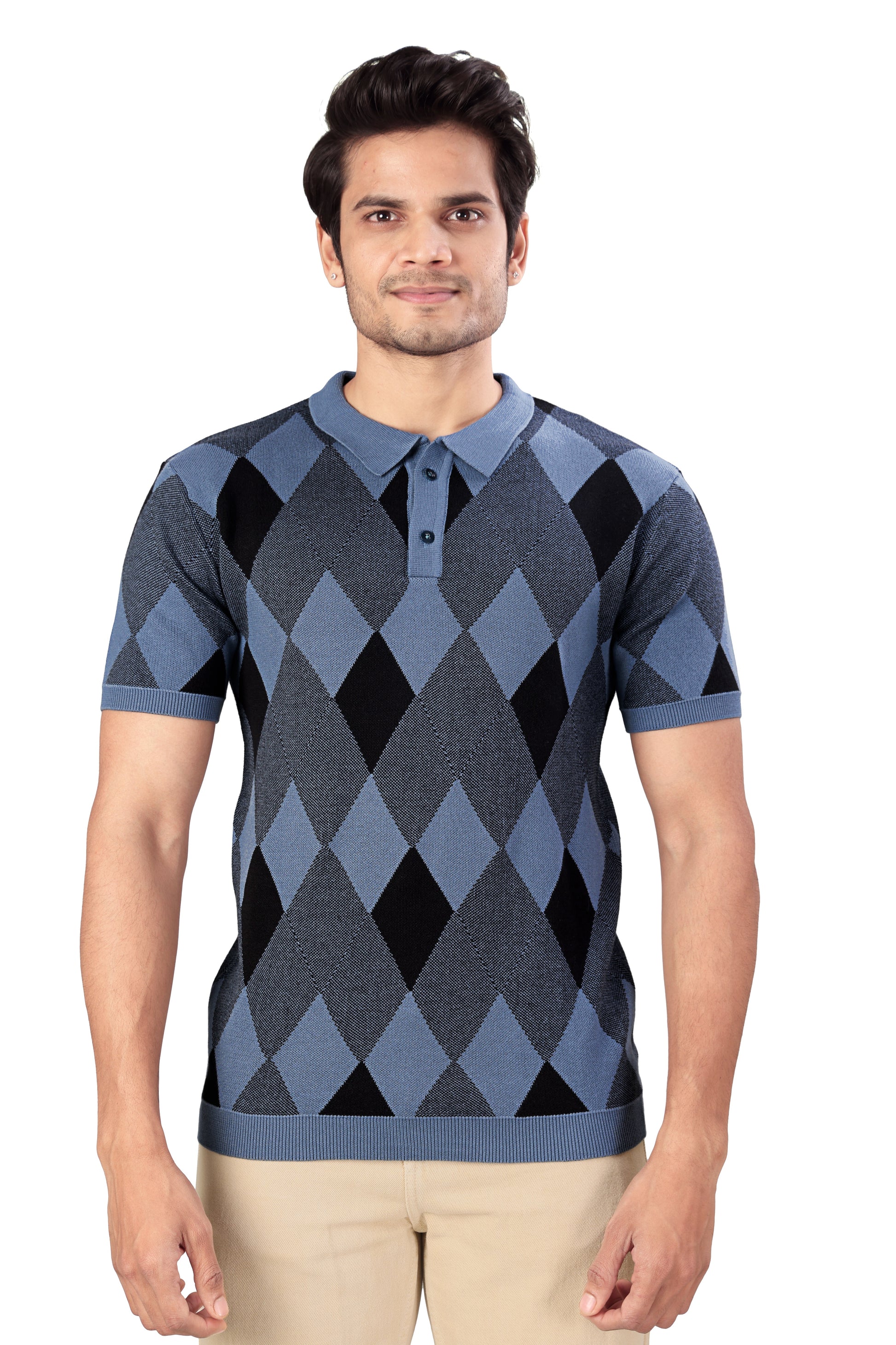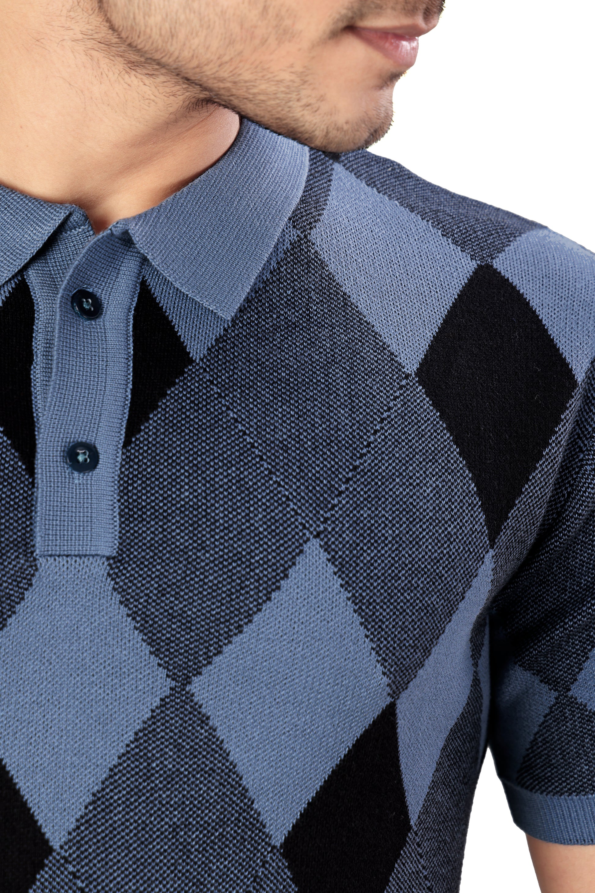 Classic knit polo featuring a blue and black argyle pattern, ribbed collar with button placket, short sleeves, and a comfortable regular fit, perfect for smart-casual and everyday wear.