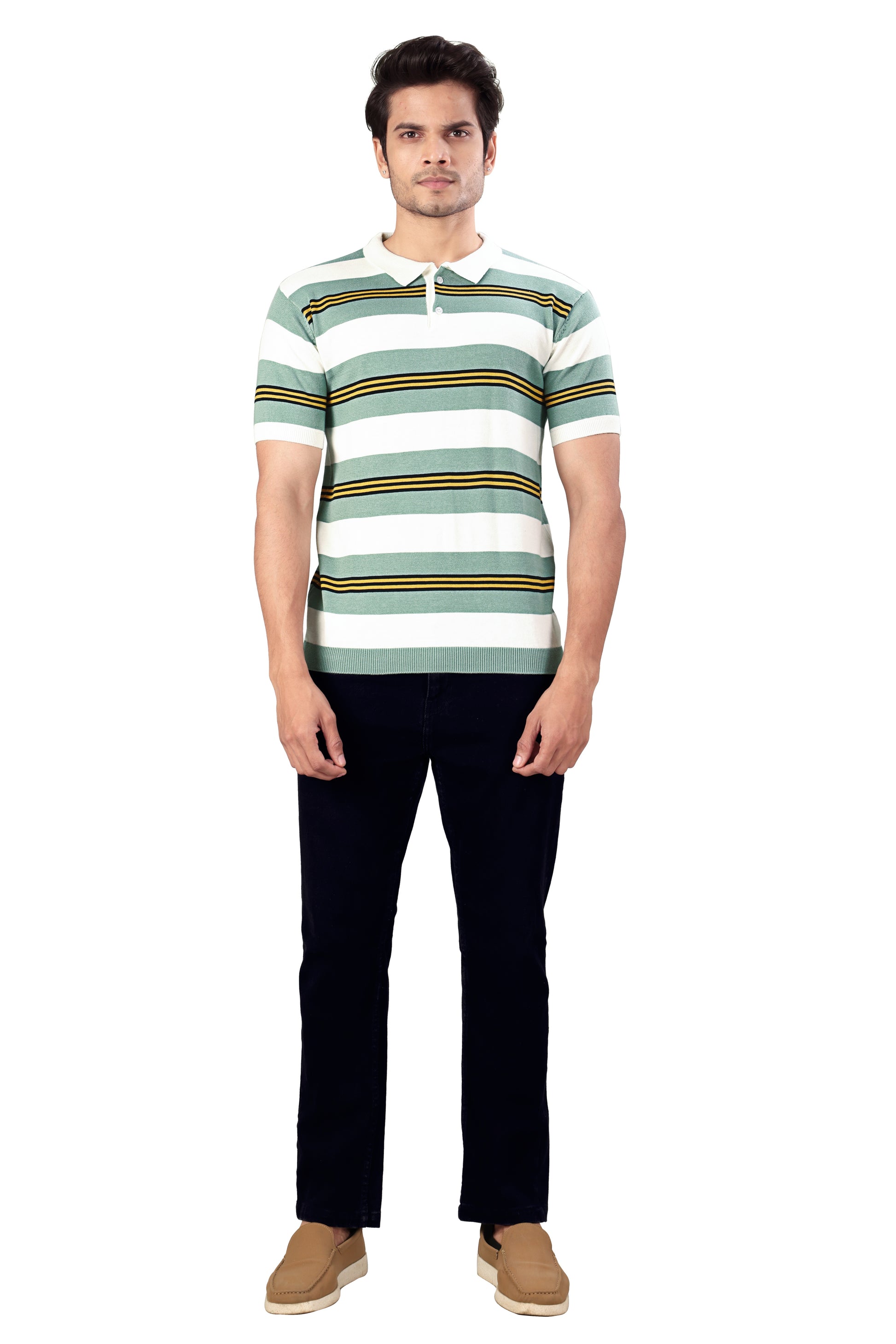 He is dressed in a short-sleeved polo shirt featuring horizontal stripes in green, white, black, and yellow. The shirt has a buttoned collar and a comfortable, casual fit. He is also wearing dark trousers He has a neatly groomed gray beard and mustache, with a calm and neutral facial expression. The overall appearance is simple, casual, and suitable for everyday wear or a studio catalog-style photograph.